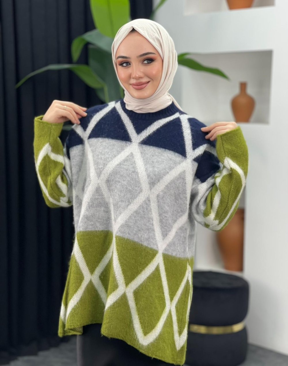Baklava Desenli Kazak Fıstık Yeşili