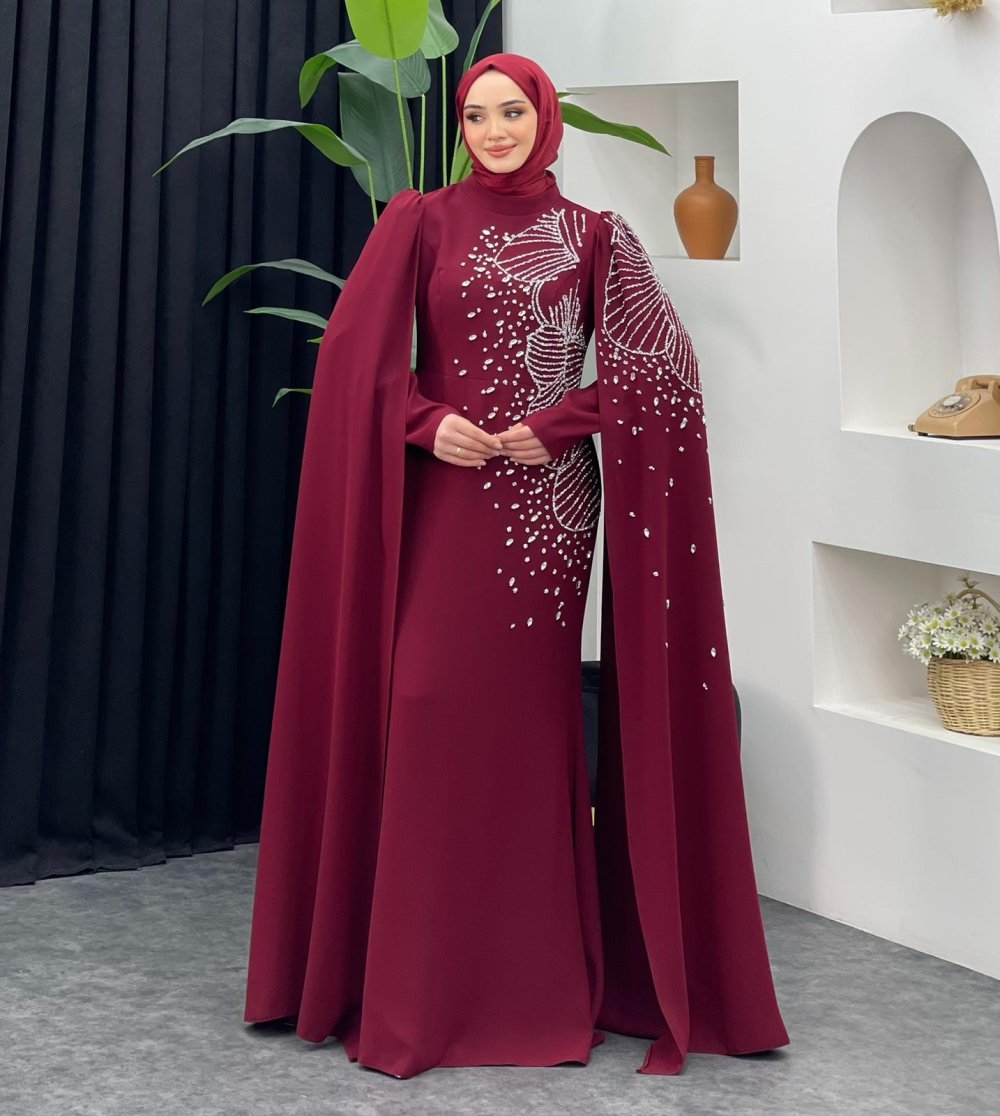 Böre Pelerinli Abiye Bordo