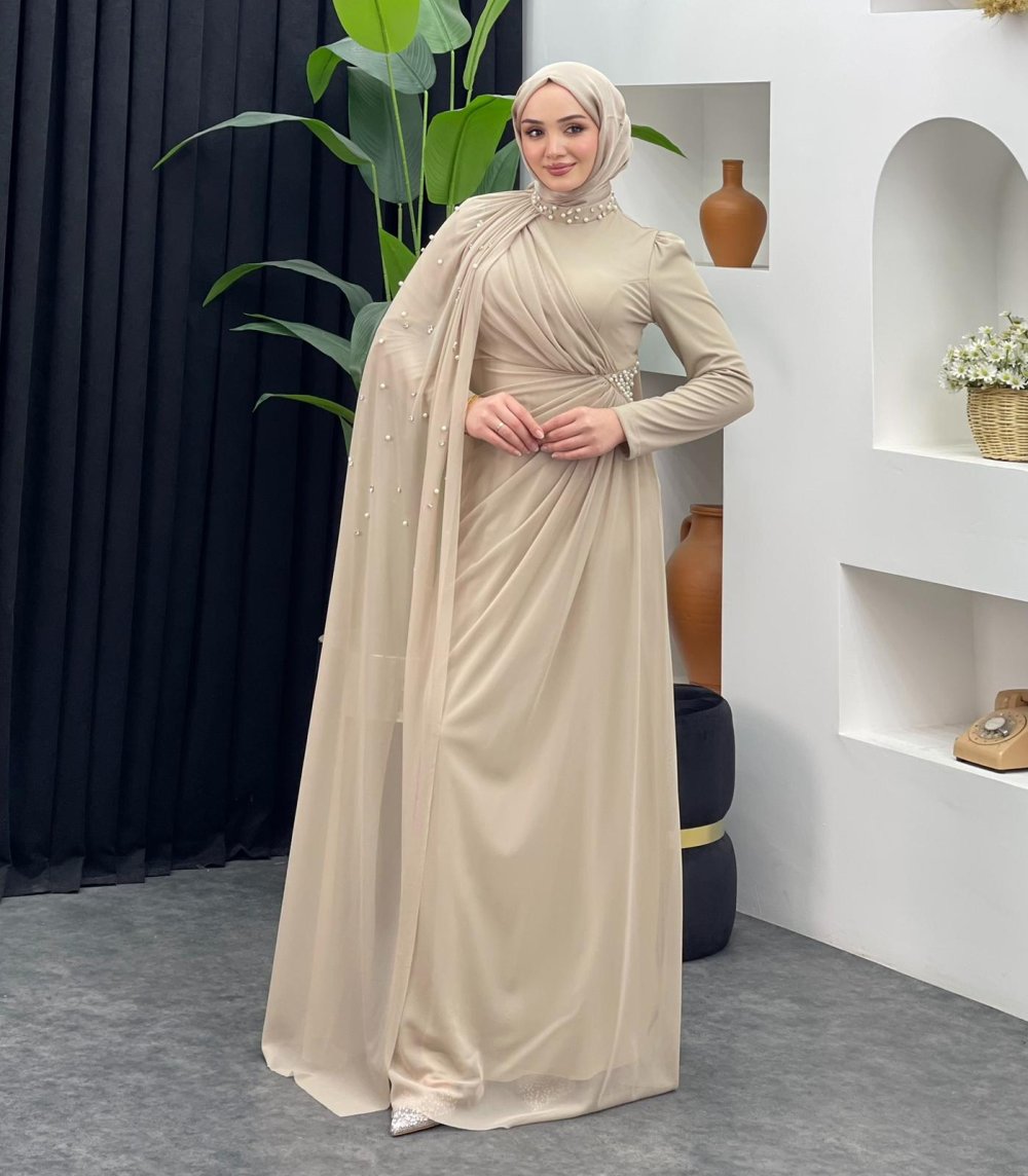 İnci Detaylı Abiye Bej
