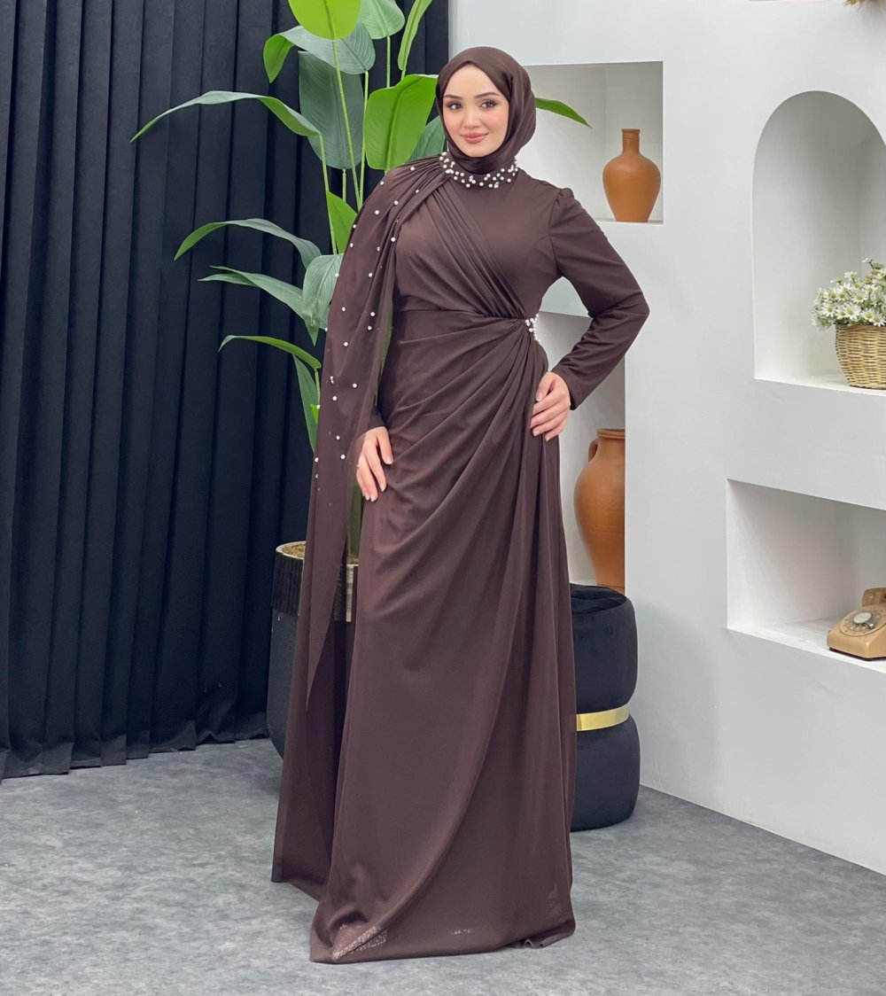 İnci Detaylı Abiye Kahverengi