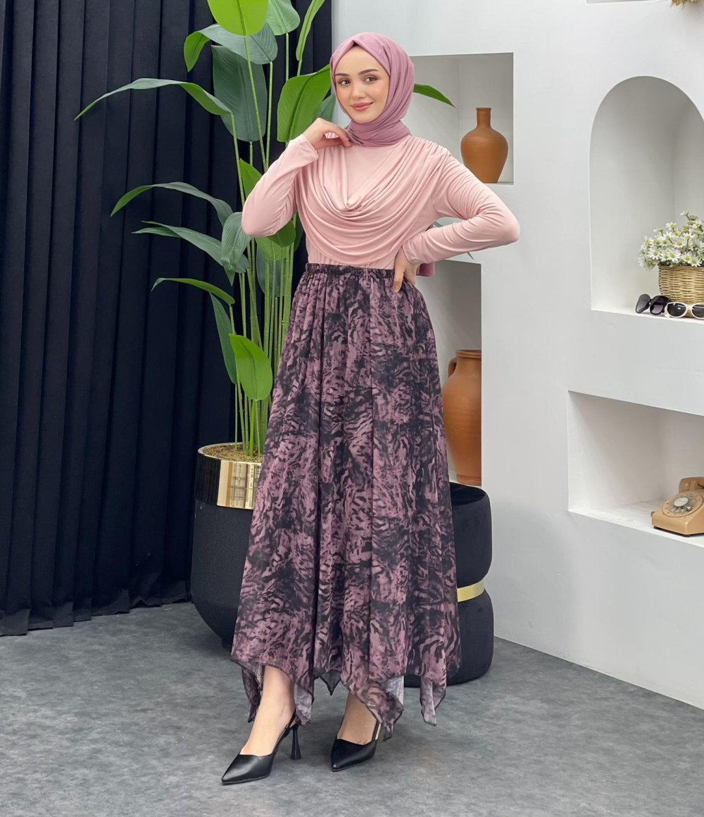 Leopar Desenli Şifon Etek Lila